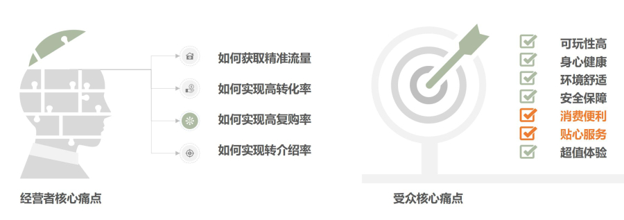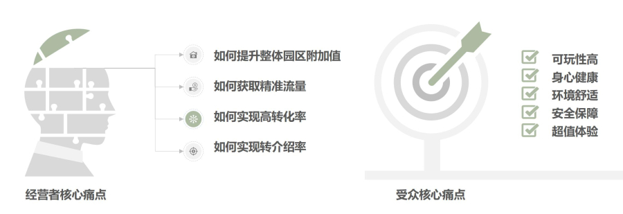 2、引流性質(zhì)的游樂場:解決經(jīng)營者4個核心痛點——如何提升整體園區(qū)附加值、如何獲取高質(zhì)量流量、如何實現(xiàn)高轉(zhuǎn)化率、如何實現(xiàn)轉(zhuǎn)介紹率;解決受眾的5個核心痛點——可玩性高、身心健康、環(huán)境舒適、安全保障、超值體驗