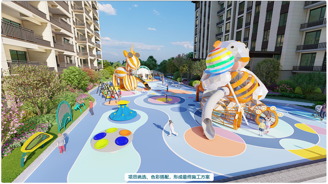 整體看,色彩溫暖豐富,設(shè)計多樣,排落有致,設(shè)計風格多采用動物形態(tài)來為游樂設(shè)備注入活力,使其更加生動。