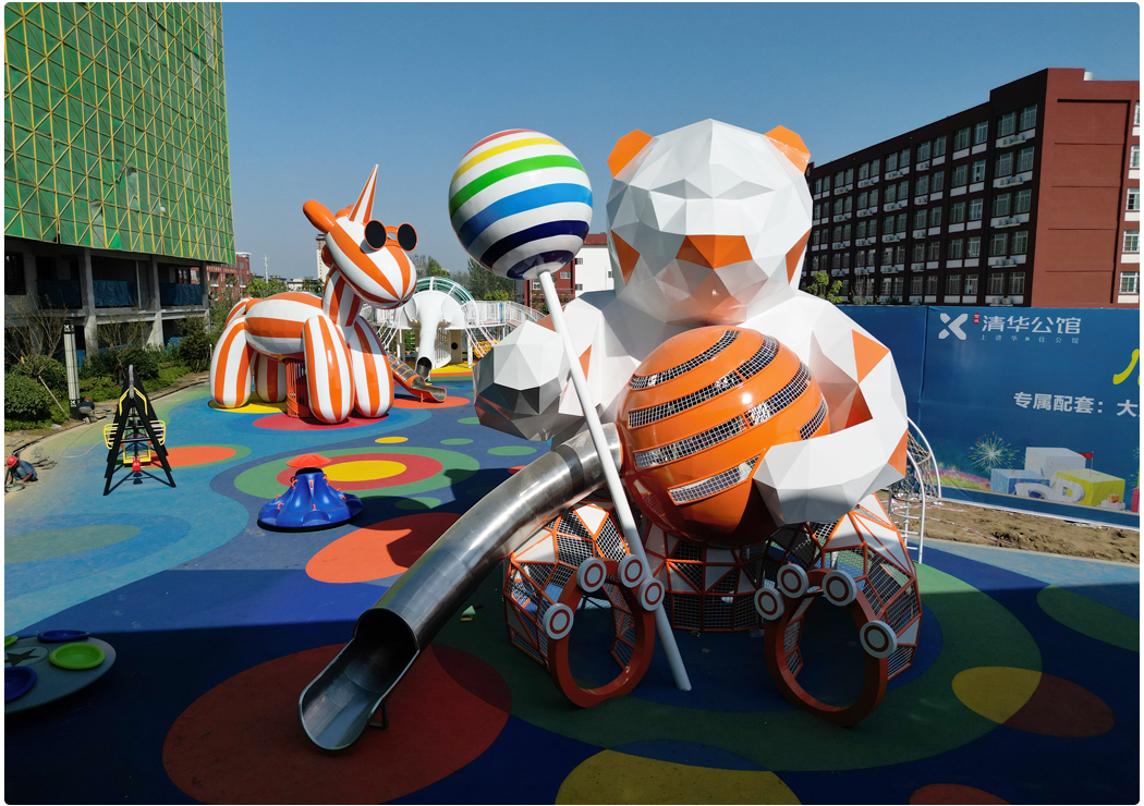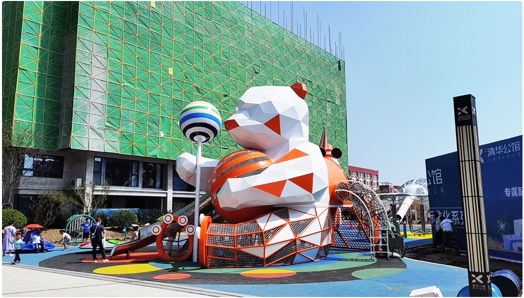 包含了爬網(wǎng),滑梯,鉆洞等多個戶外游樂設(shè)備項目,集多個運動于一身,滿足了小朋友的游樂需求,也為游樂設(shè)備增添了幾分趣味性。將繩網(wǎng)遍布于設(shè)備周圍,安全與玩樂相輔相成。小朋友們從熊造型后面攀爬進入熊的身體,從熊前面的滑梯滑下;也可通過鉆洞等其他設(shè)備項目安全到達地面。