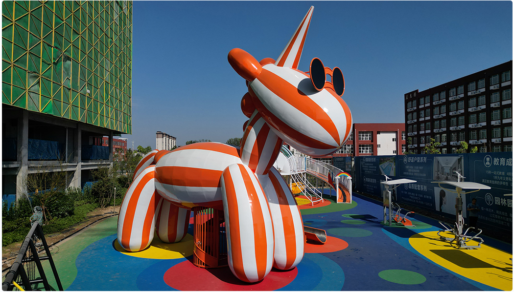 帶著酷酷的眼睛矗立在游樂場地中央,由白色和黃色的橢圓勾勒出斑馬造型,圓潤飽滿,看起來十分活潑,栩栩如生。主要以旋轉(zhuǎn)樓梯,滑滑梯,秋千等游樂設(shè)備項目為主,斑馬造型為該設(shè)備增添了幾分靈動。從旋轉(zhuǎn)樓梯到達滑梯口,呲溜以下,滑到底部。滑梯采用的是拐彎式設(shè)計,在向下滑時,增大摩擦力,減緩速度,避免孩子摔倒。